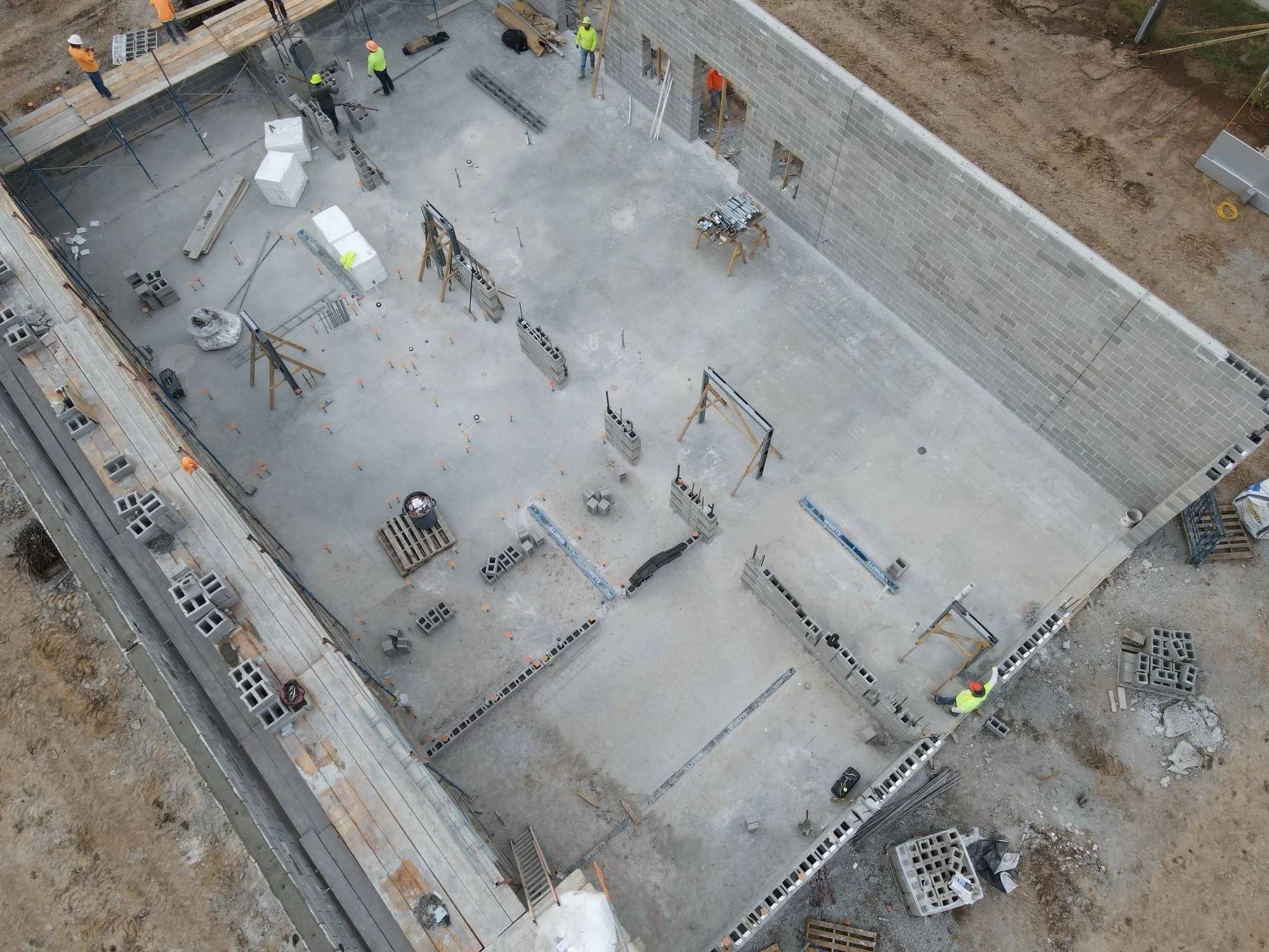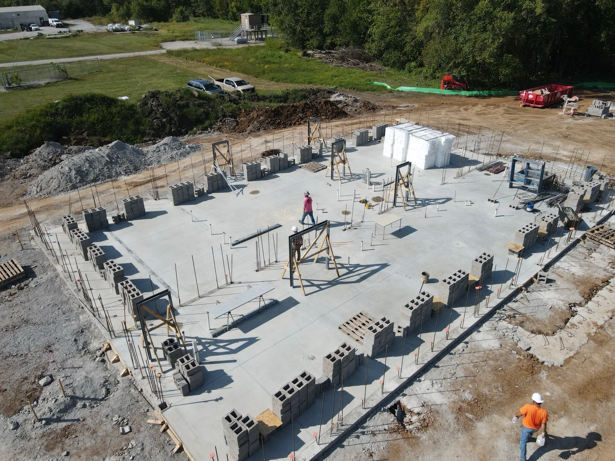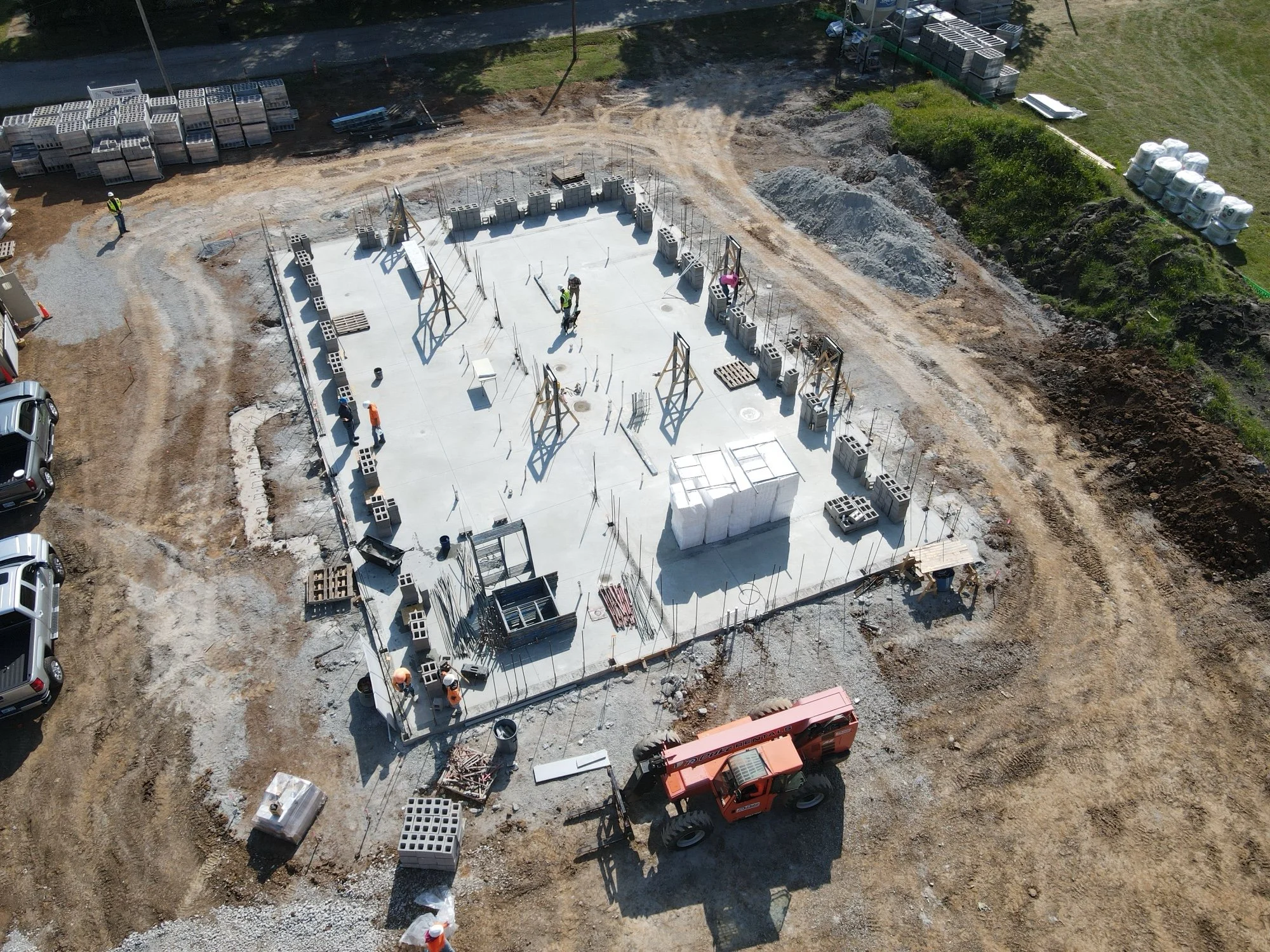 September 2025: Electrical and plumbing underground rough-in completed; slab on grade concrete placement; CMU block installation; concrete footings completed; door frames set in preparation for block wall erection;